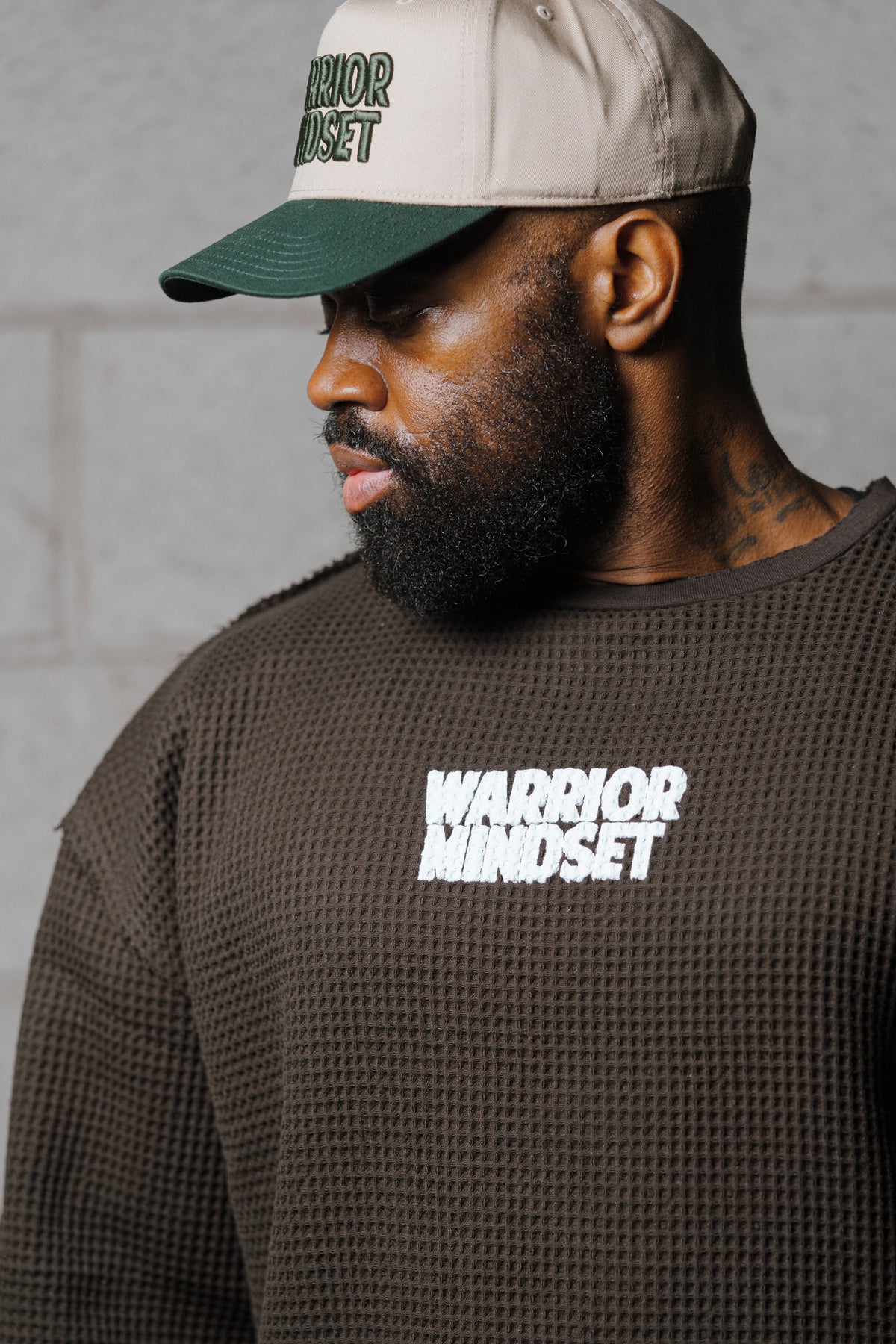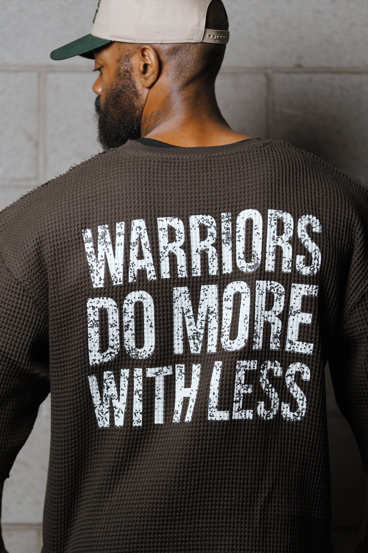 Oversized Waffle-Knit Battle Top – “Warriors Do More With Less” - Battlefield Brown